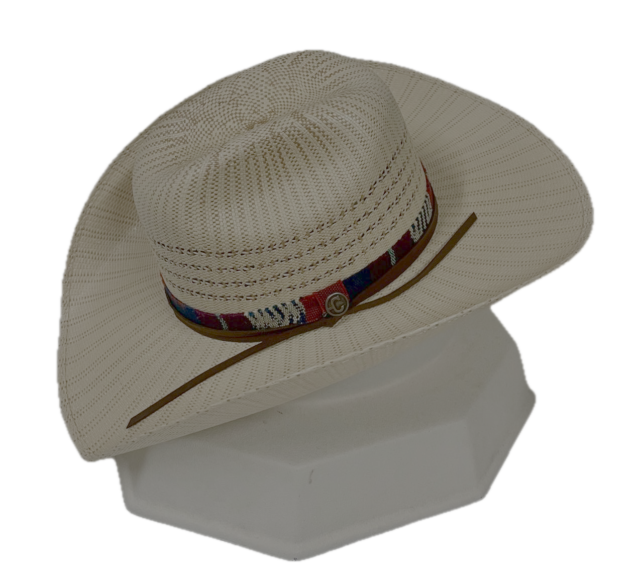 The Corral Justified Two Tone Vented Bangora Straw Hat combines classic Western style with lightweight comfort. Made from durable vented Bangora straw, it features a short cattleman crease, a bold 4 1/4" brim with Western flange, and a Guatemalan fabric hatband with suede accents for an artisan finish.